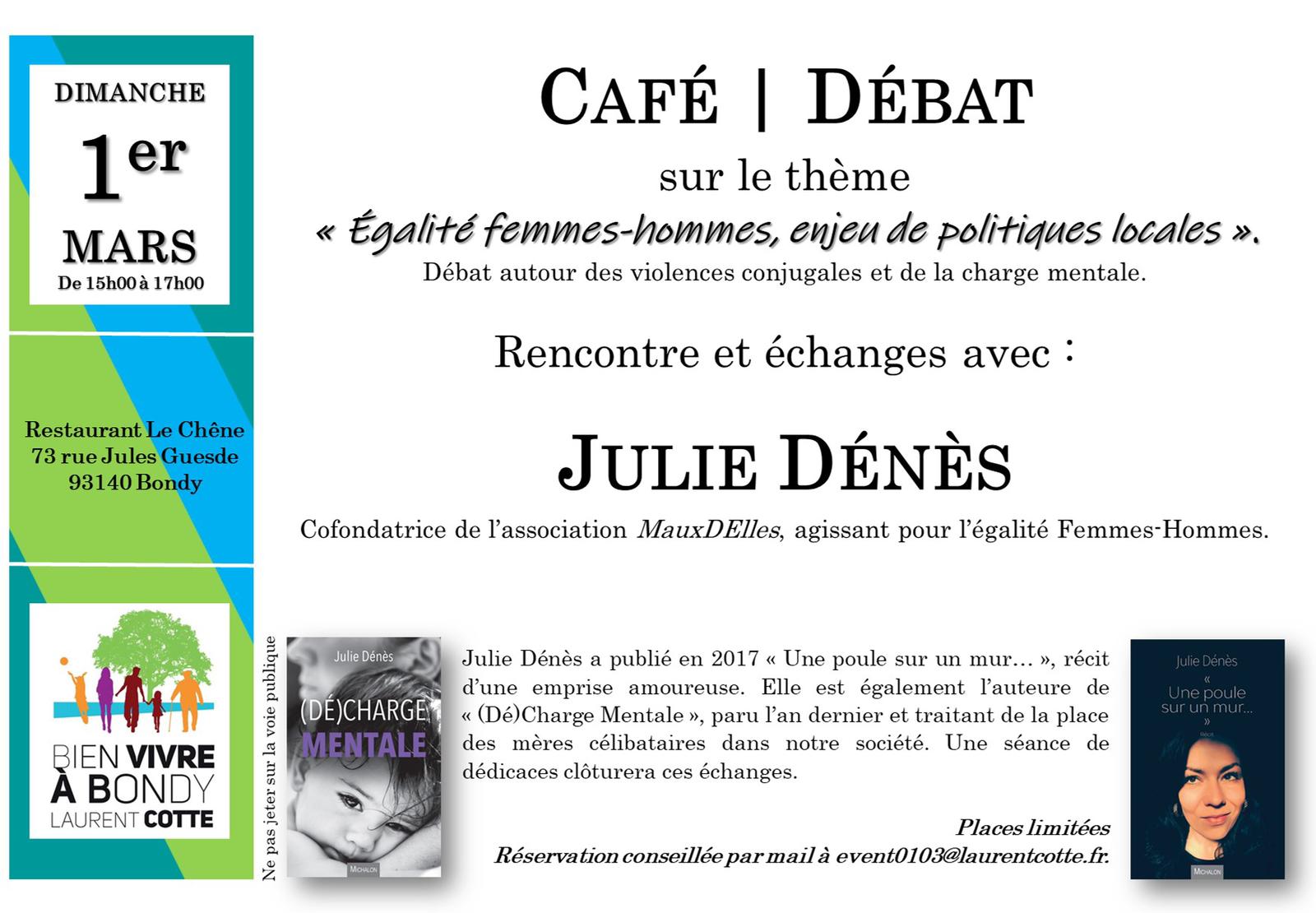 Nous vous donnons rendez-vous dimanche 1er mars à 15h00 au restaurant Le Chêne en cœur de ville de Bondy, pour un café-débat avec Julie Dénès écrivaine, co-fondatrice de l'association " MauxDElles", agissant sur l'égalité Femmes-Hommes.